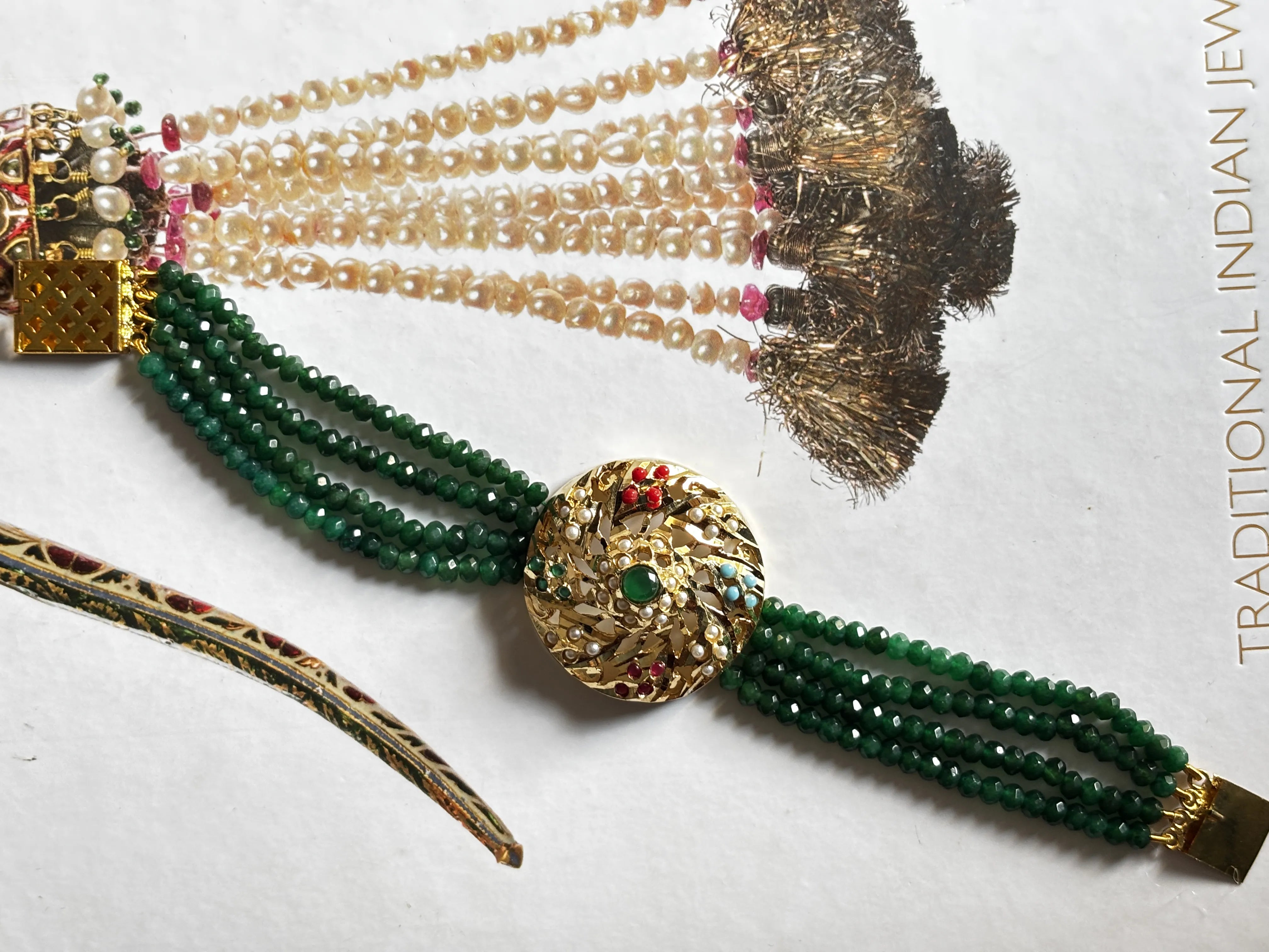 A striking bracelet crafted with rich green bead strands and a detailed Jadau centerpiece accented with ruby and pearl highlights. Elegant and traditional, it adds a regal finish to festive and ethnic ensembles.