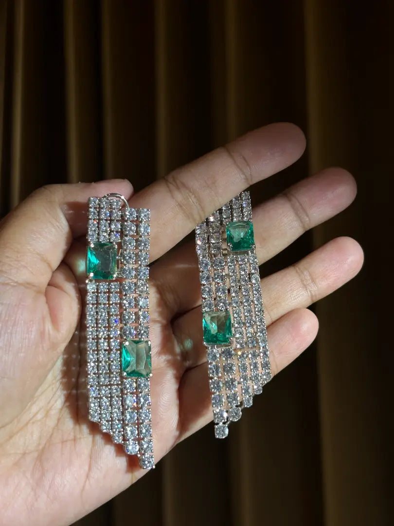 Description: These danglers are studded with diamonds and Aqua stones that just emanate a shine across the room. Wear it with any black dress and this will be the star of the night with you.