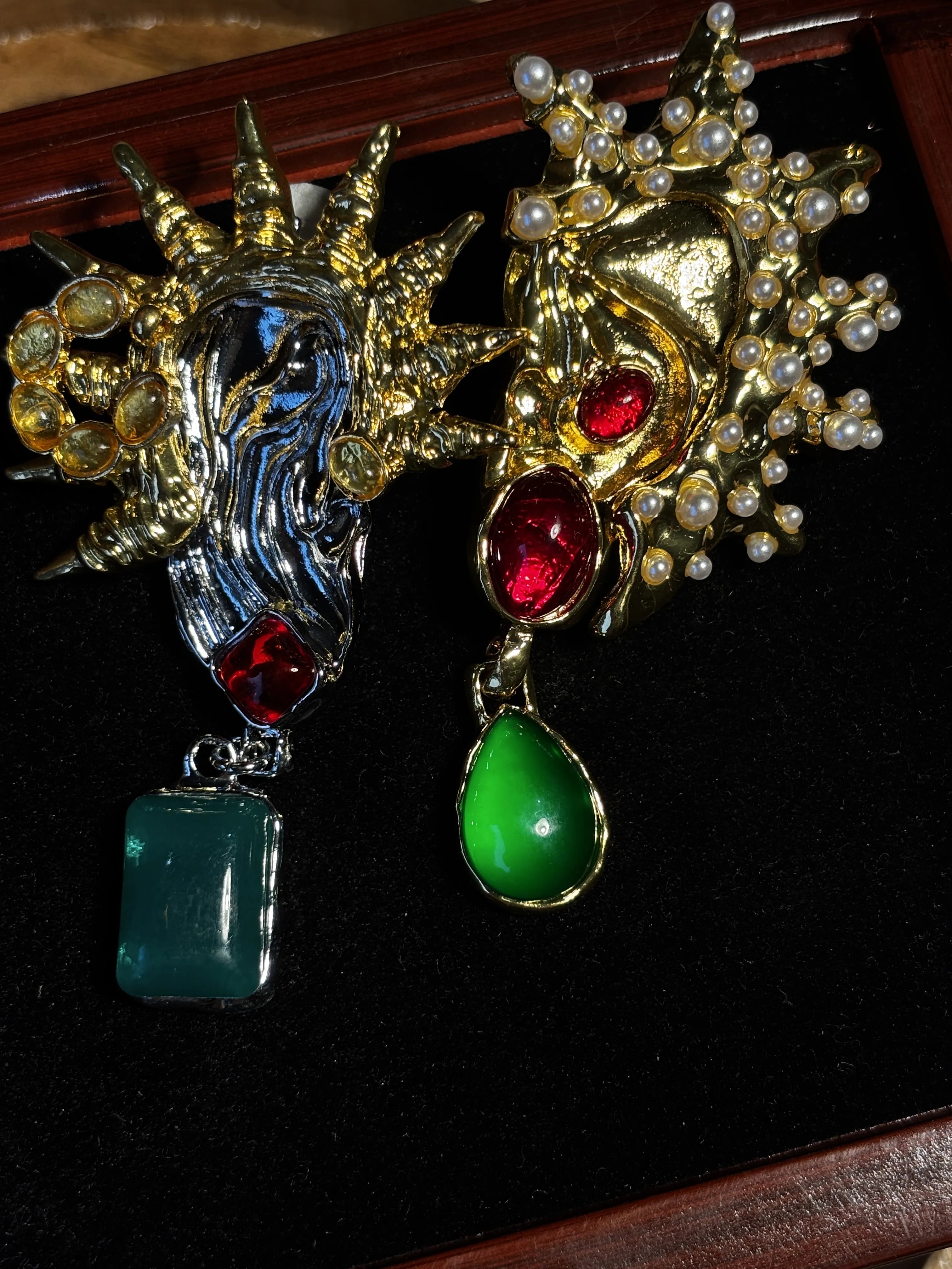 Bold, artistic statement earrings inspired by mythical forms, featuring rich red accents, luminous pearl detailing, and a striking emerald-green drop. Sculptural and expressive, this pair is designed for those who love jewellery that feels powerful, regal, and unapologetically unique.