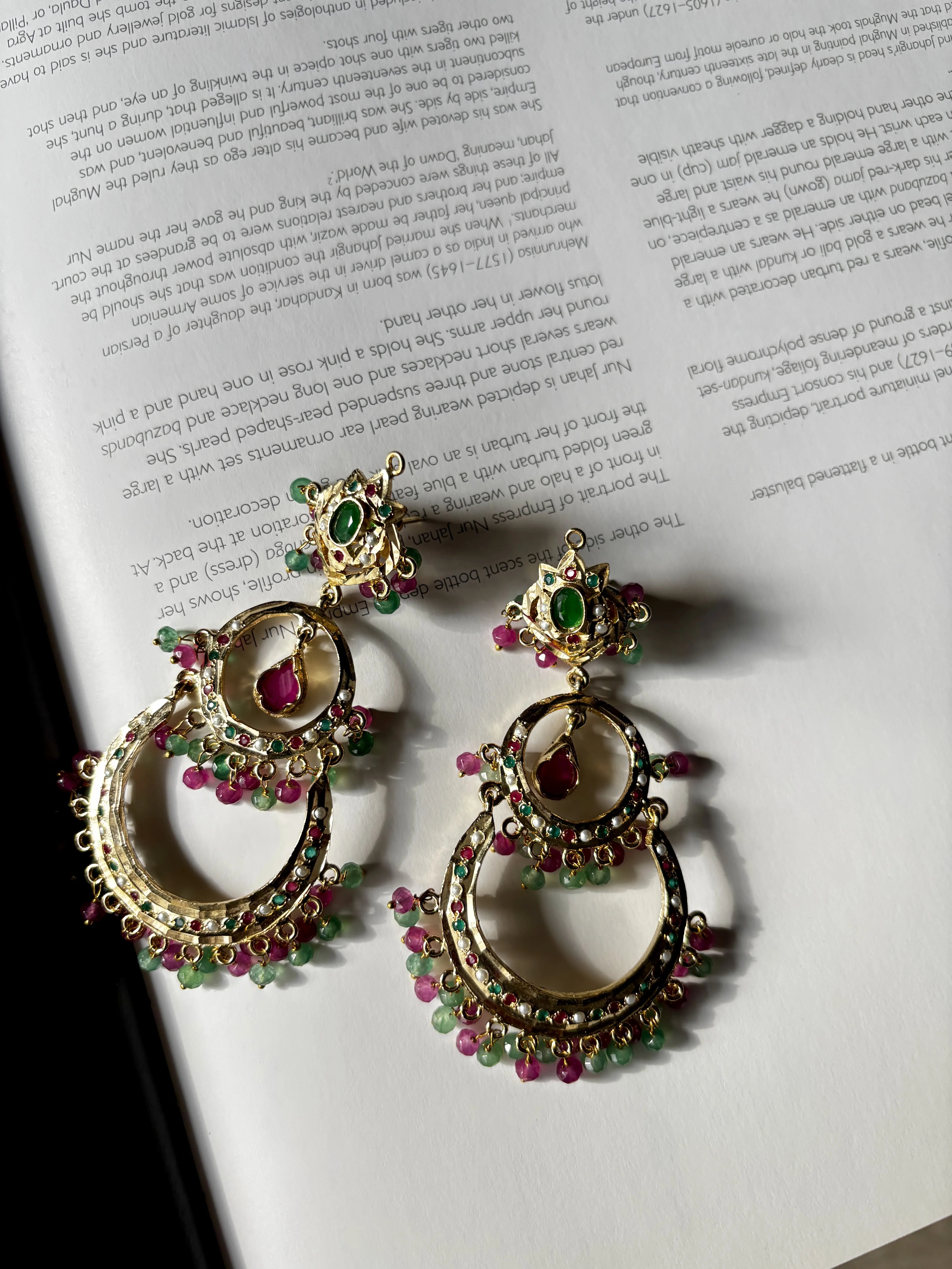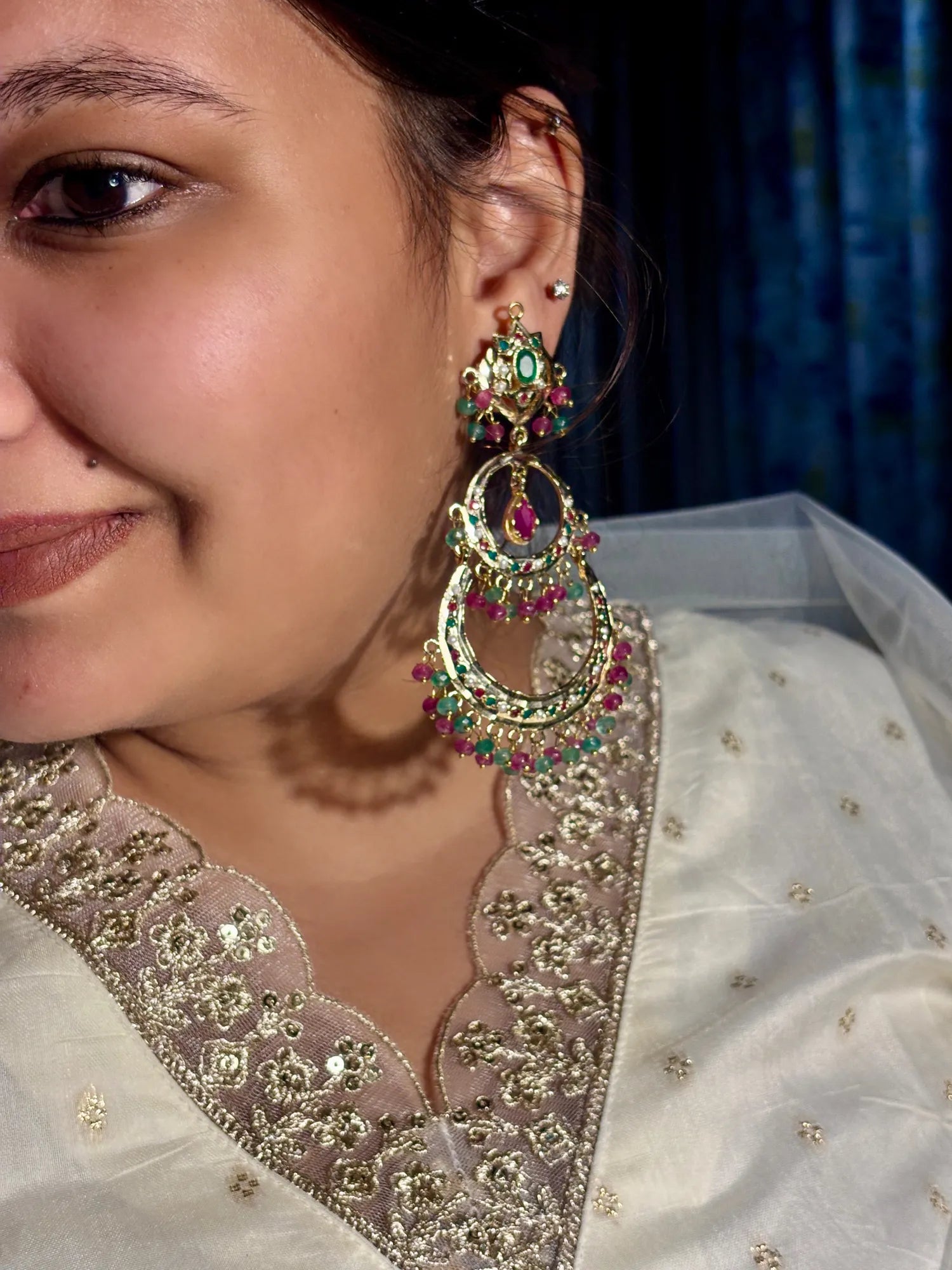 A vibrant pair of kundan-style chandbali earrings adorned with ruby and emerald tones, finished with delicate bead drops. Intricately handcrafted, they bring a perfect blend of heritage charm and festive elegance.