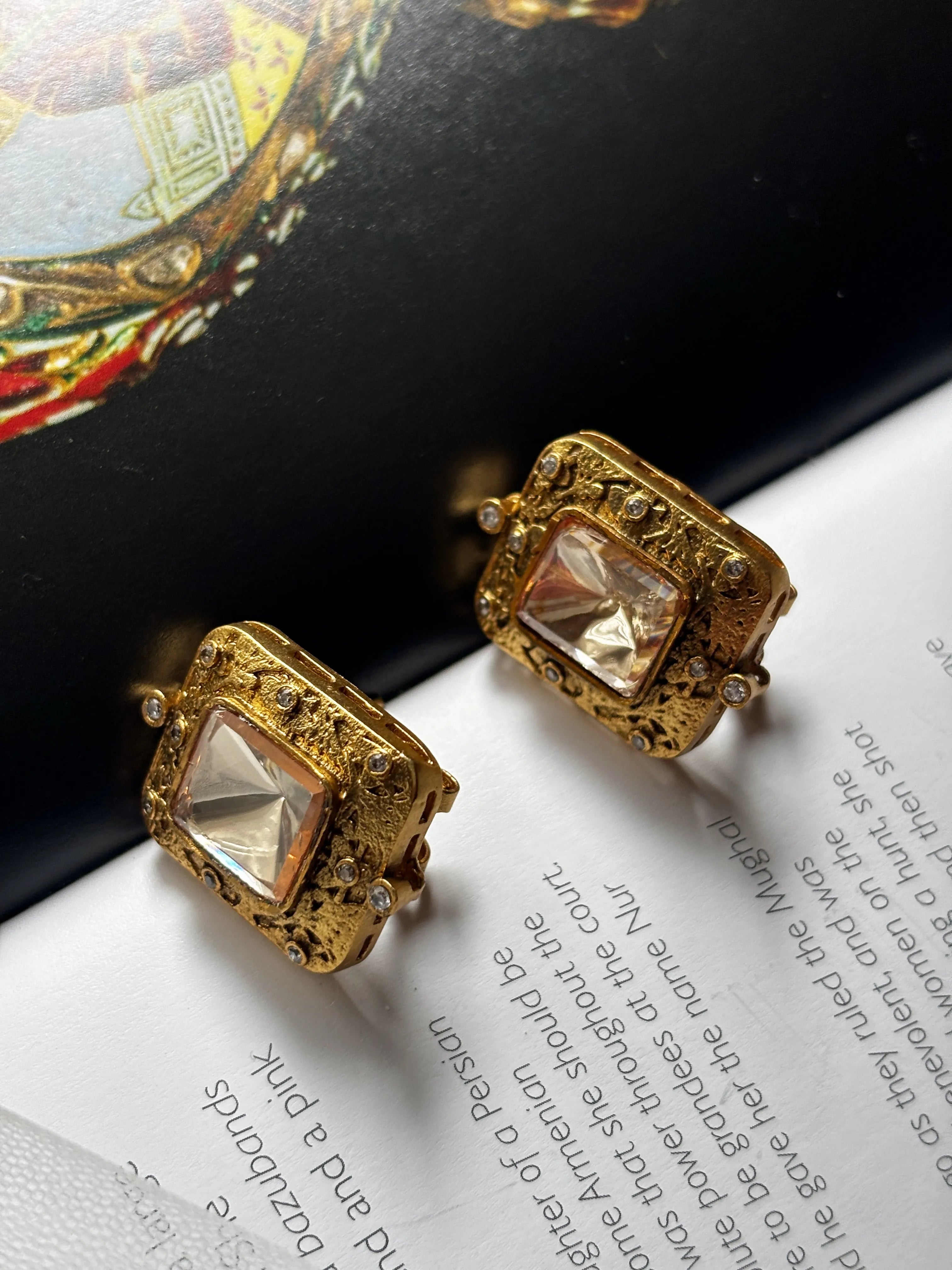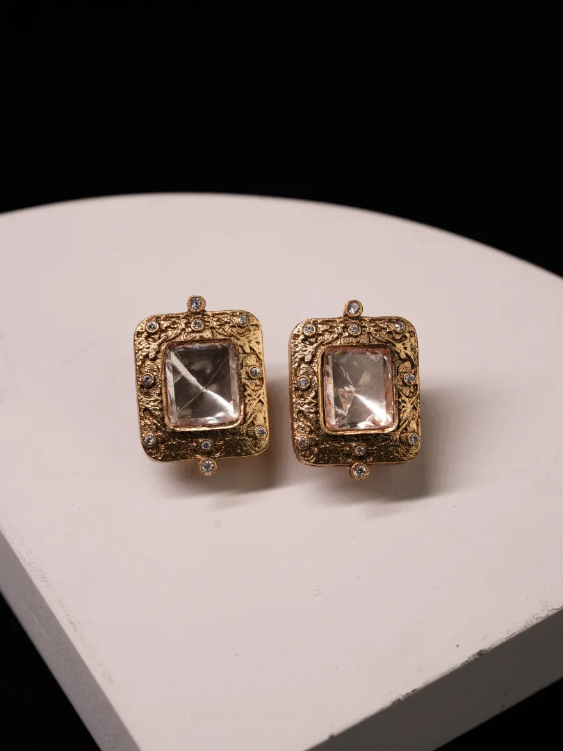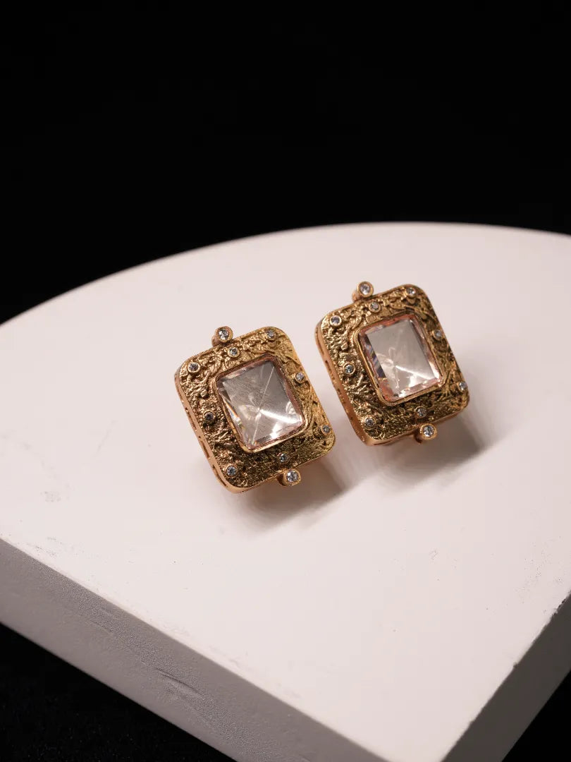 Refined square stud earrings crafted in an antique gold finish, featuring faceted clear stones framed by intricate hand-etched detailing and subtle crystal accents. A vintage-inspired essential that adds understated elegance to both everyday and occasion looks.