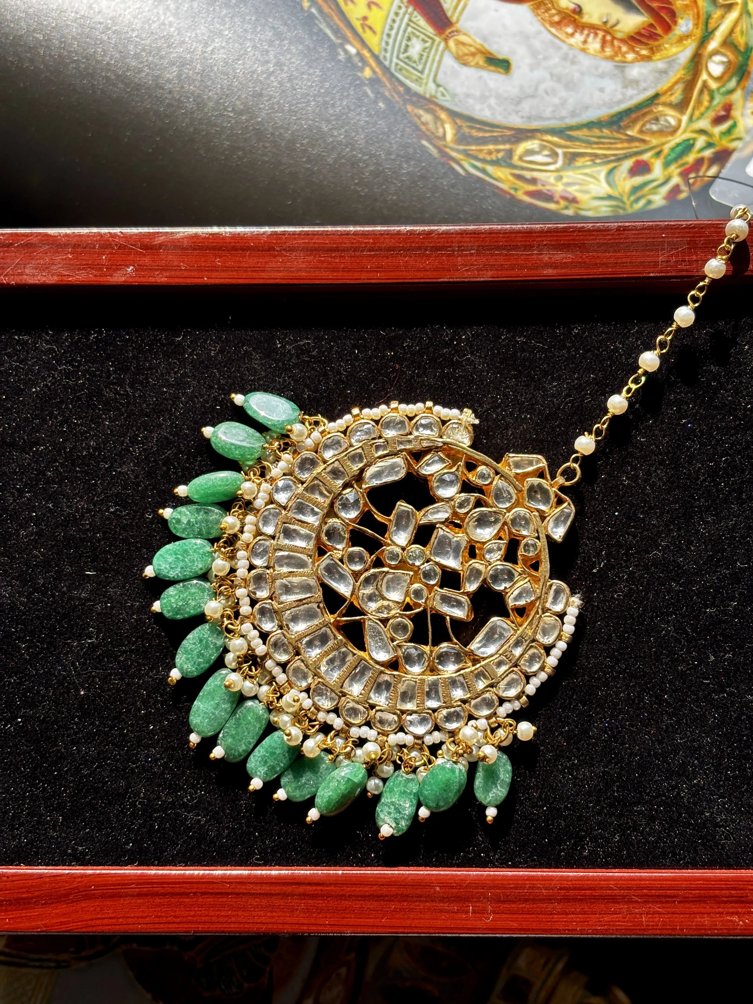 A striking round kundan motif handcrafted with layered pachi kundan stones, finished with delicate pearls and emerald-green drops. Rich in heritage detail, this maang tikka adds a regal focal point—perfect for bridal looks and classic festive ensembles.