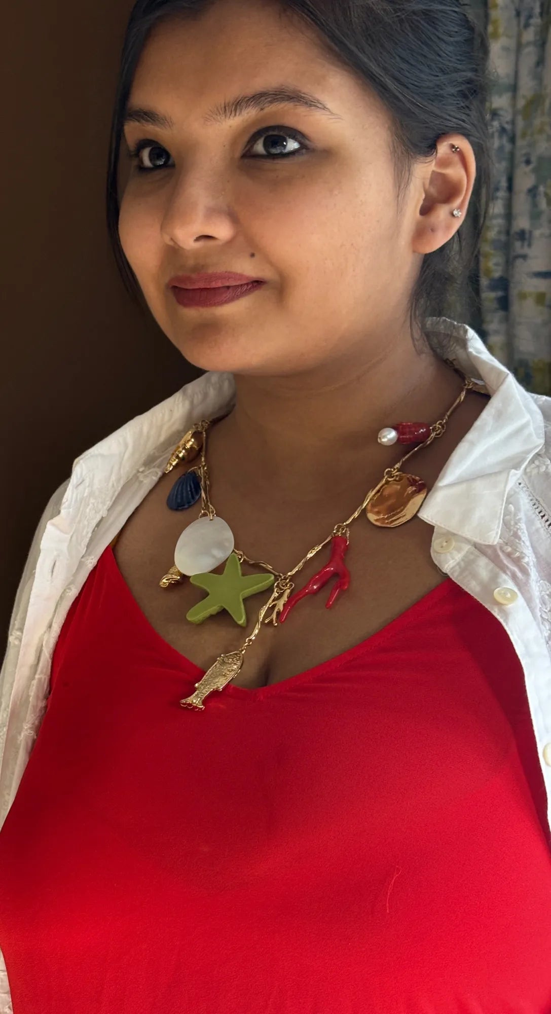 nspired by treasures of the sea, this statement necklace brings together an eclectic mix of marine-inspired charms—starfish, shells, coral, and sculpted motifs—set along an organic gold-toned chain. Each charm adds its own pop of colour and character, creating a joyful, free-spirited silhouette that feels both artistic and wearable. Lightweight yet eye-catching, this necklace is perfect for resort wear, summer brunches, vacations, or adding a bold twist to minimal outfits.