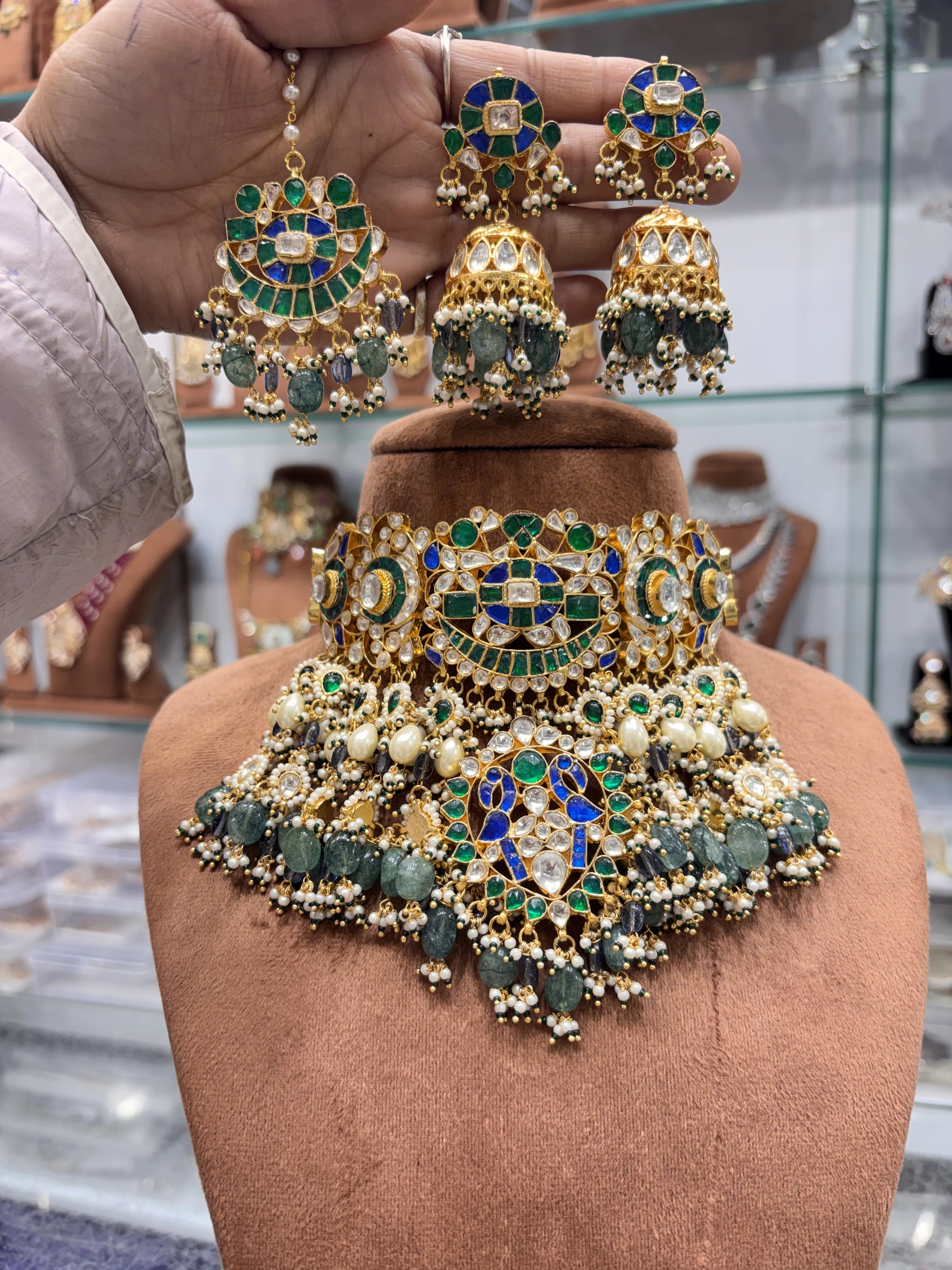 The neckline is beautifully finished with layers of delicate pearl and green bead drops, creating graceful movement and regal depth. Bold yet balanced, this choker frames the face exquisitely, making it an ideal centrepiece for bridal wear, engagement looks, or grand festive occasions.