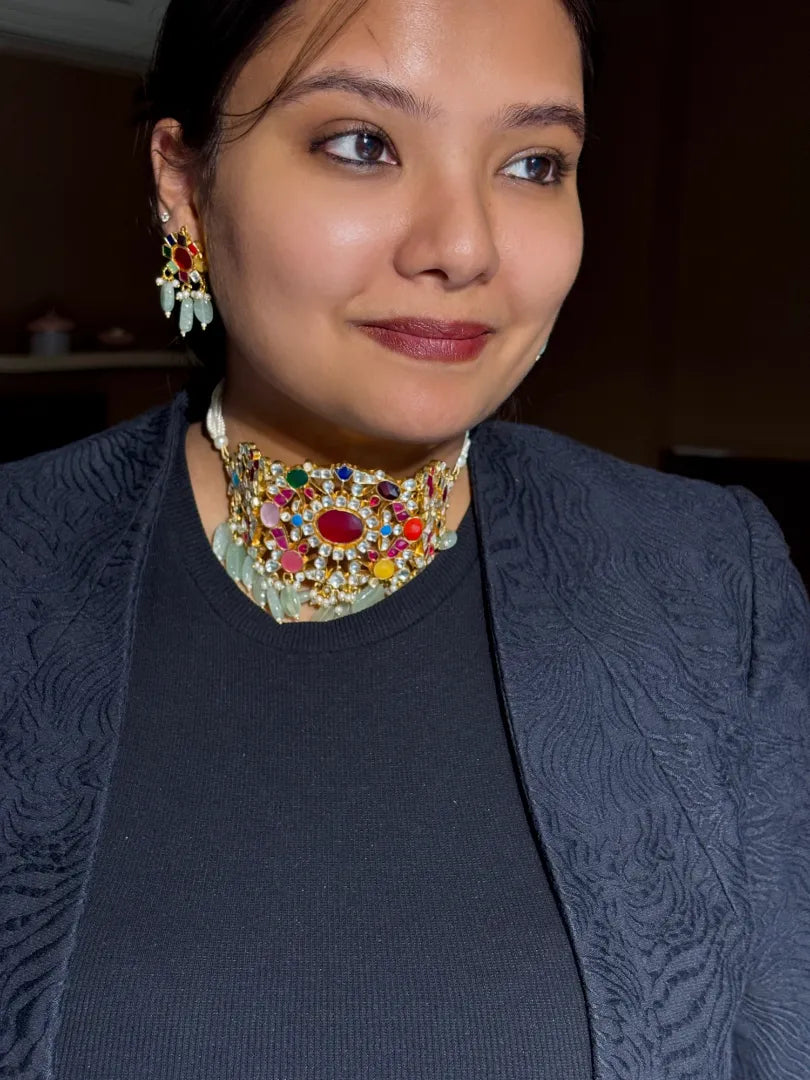 This stunning multicolor 22k gold plated pachi kundan choker is one of a kind that will go with any outfit - contemporary or ethnic. This necklace is studded with beautiful stones which are semi precious with pearl drawstrings to give it that perfect sophistication. Now this is the kind of necklace that's legacy driven and timeless - something to preserve and pass on.