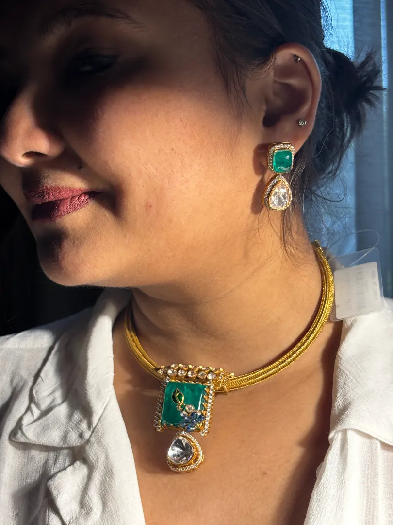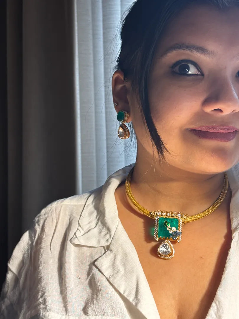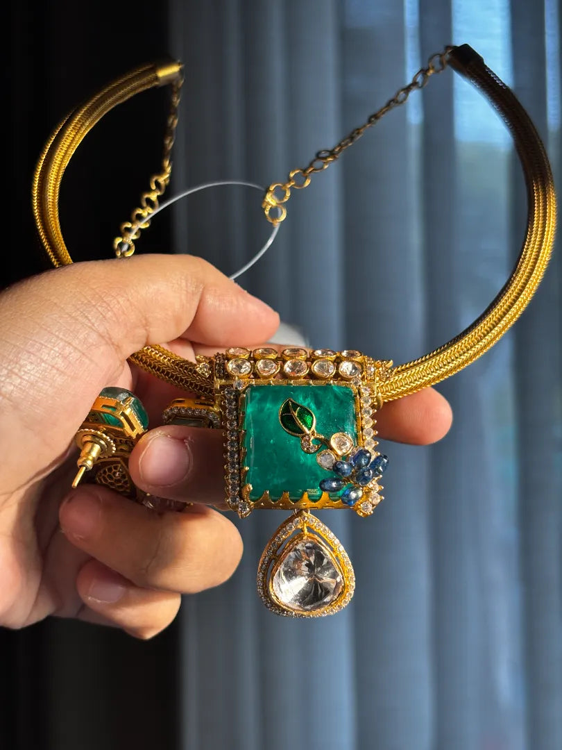 This Hasli set is a masterpiece with high quality Moissanite sets set across its pendant drop and beautiful motifs set in its centrepiece.