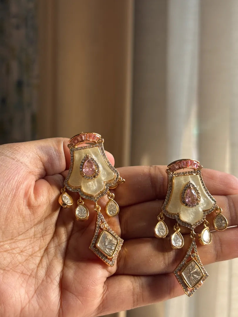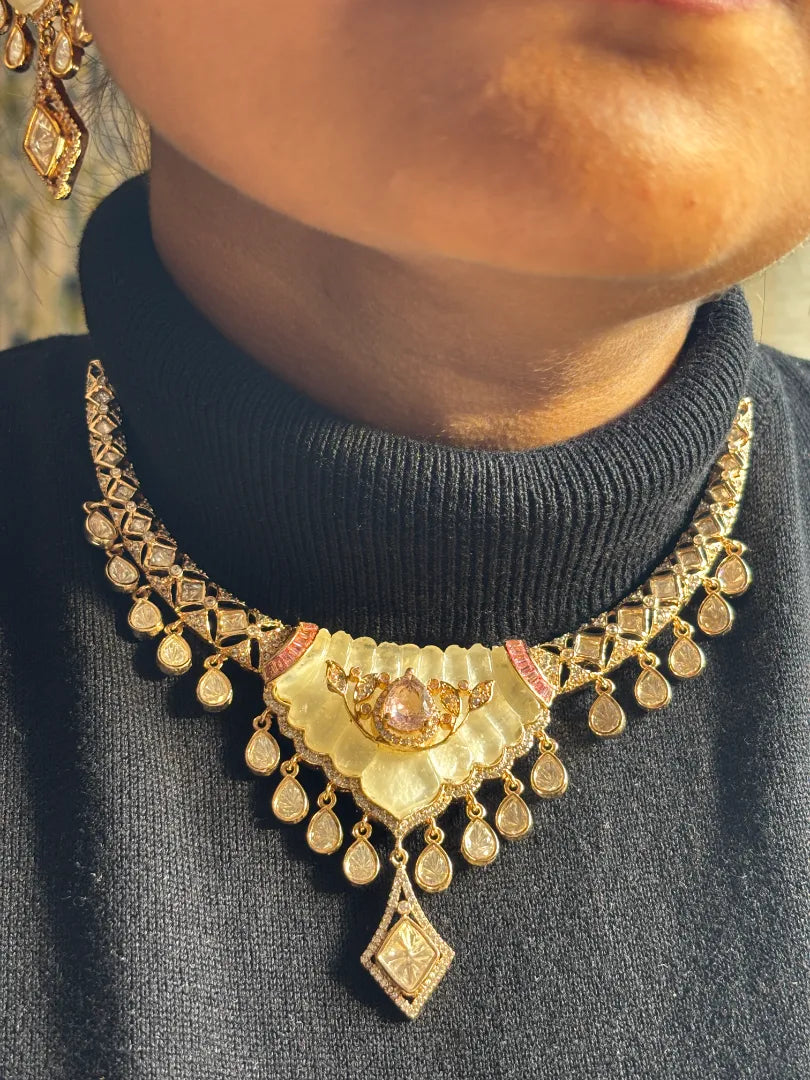 Our exquisite Mother of Pearl Necklace, a truly stunning piece designed to elevate any jewelry collection. This elegant necklace features lustrous mother of pearl work throughout, beautifully complemented by delicate pink sapphires.