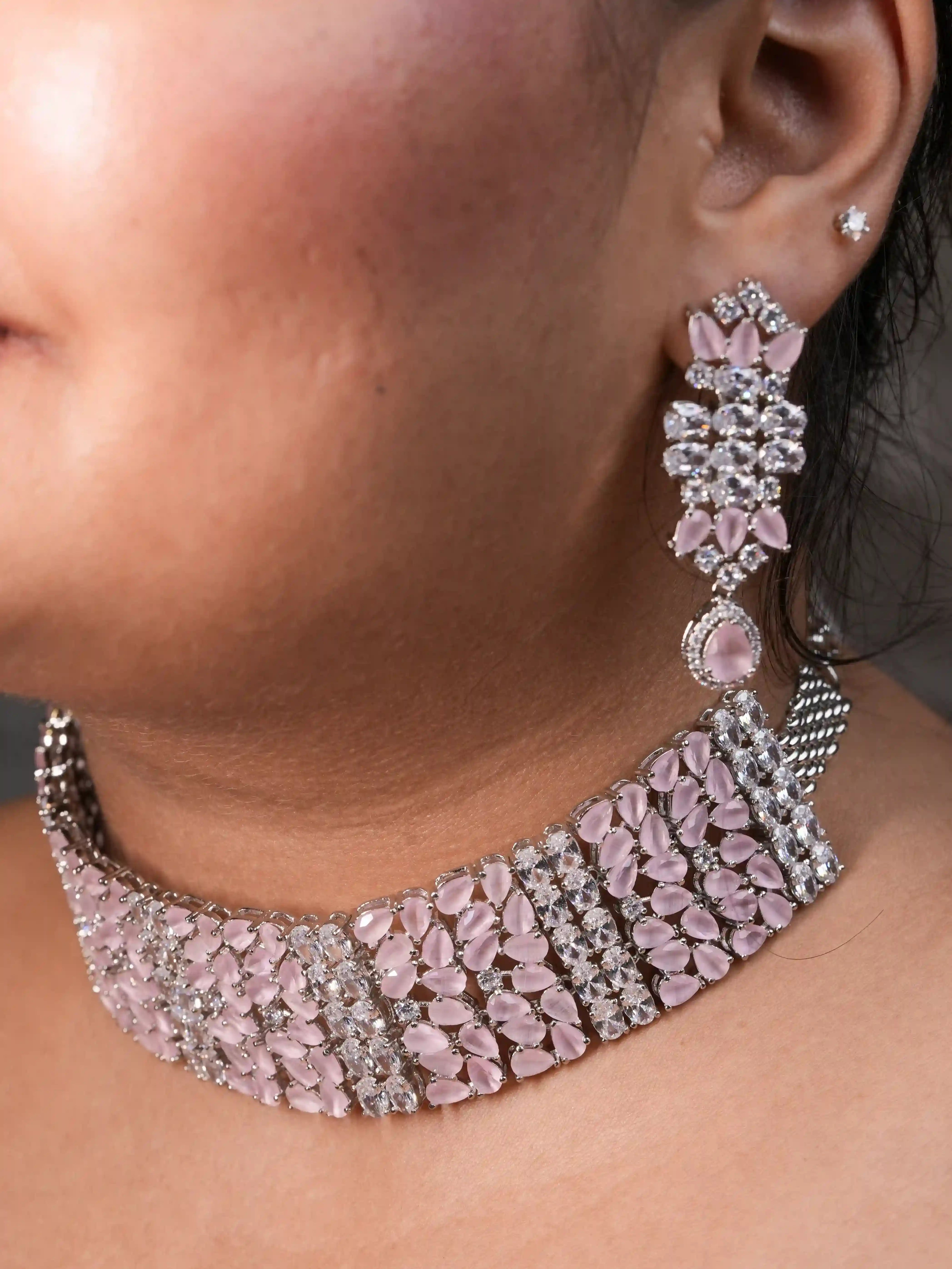 A vision of refined glamour, this exquisite choker set is designed to illuminate the neckline with soft elegance. Crafted in a sleek silver-toned finish, the choker features delicately arranged blush-pink marquise crystals interwoven with rows of brilliant clear stones, creating a rich, textured sparkle that feels both romantic and contemporary.