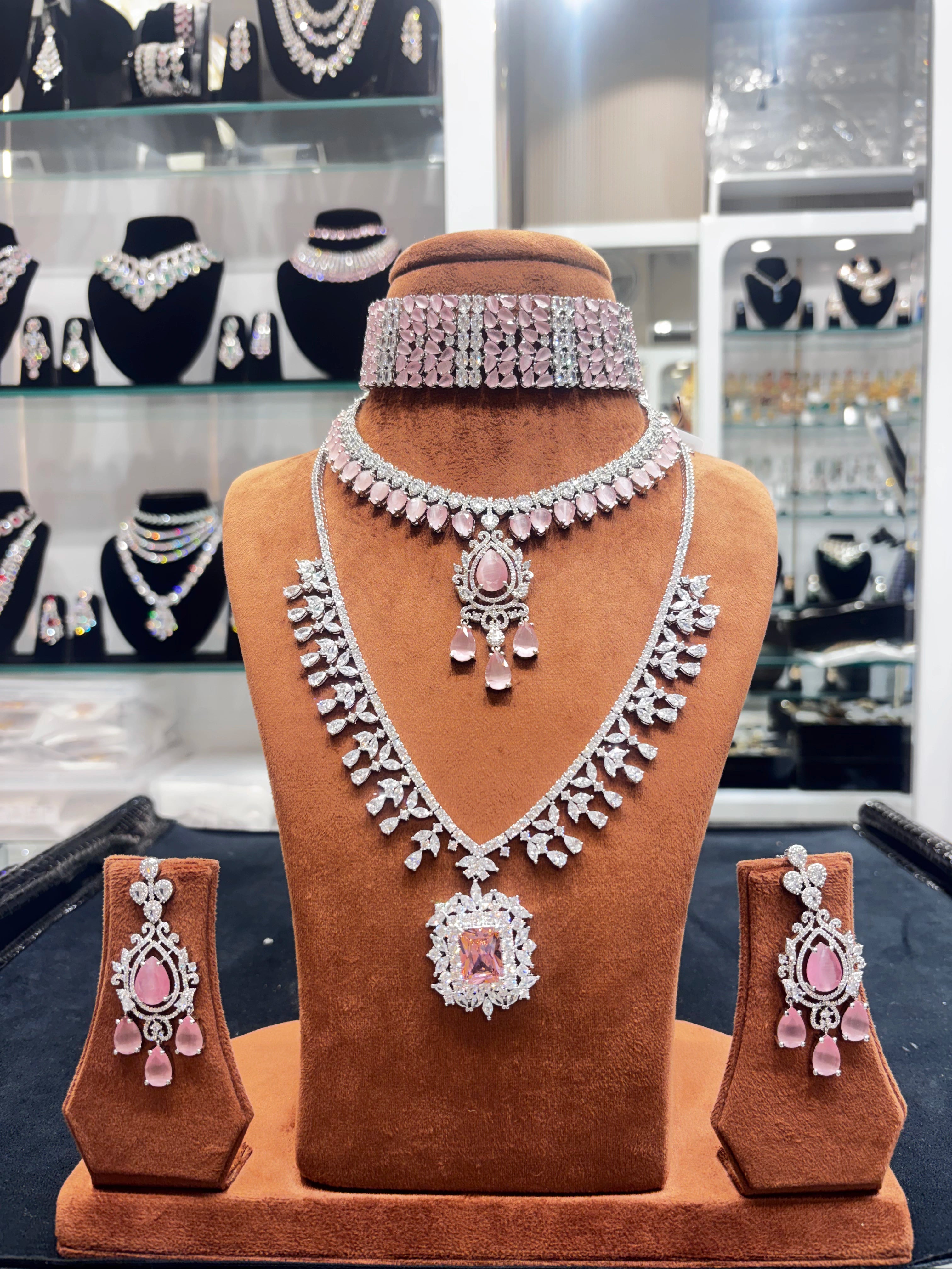 The matching statement earrings echo the choker’s graceful silhouette, cascading with blush crystal accents and clear pavé detailing for a striking yet balanced look. Together, the set frames the face beautifully, making it an ideal choice for brides, receptions, cocktail evenings, and luxe celebrations.