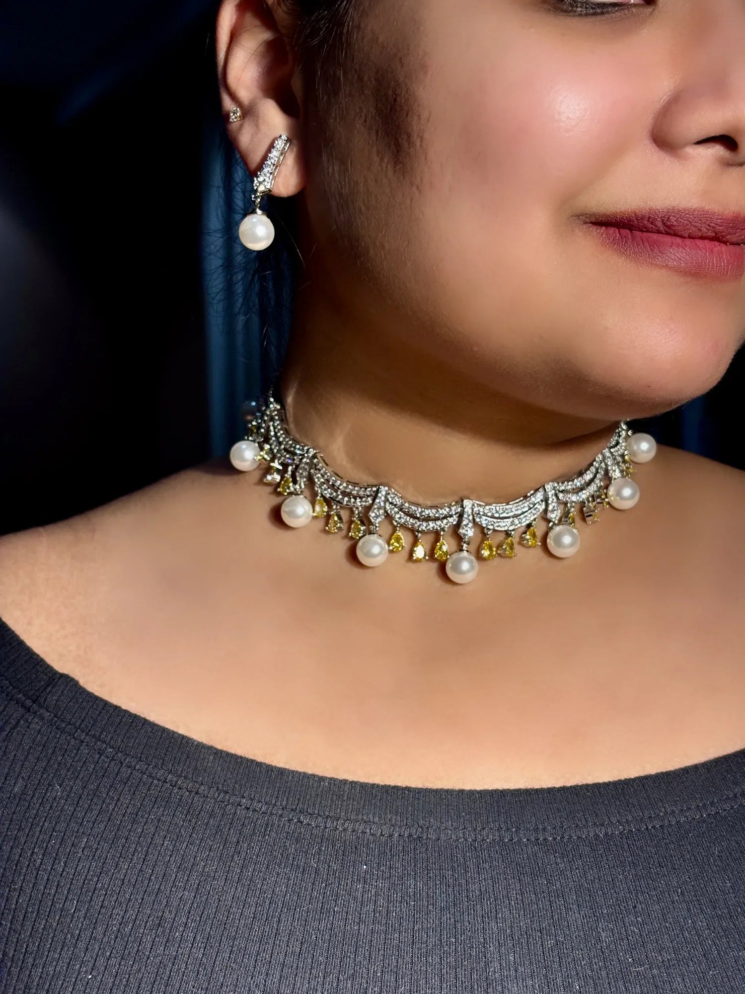 An exquisite blend of classic elegance and refined sparkle, this handcrafted choker is designed to grace the neckline with effortless sophistication. Set in a radiant silver-toned base, the choker features intricate crescent motifs encrusted with shimmering clear crystals, delicately accented with warm yellow teardrop stones.