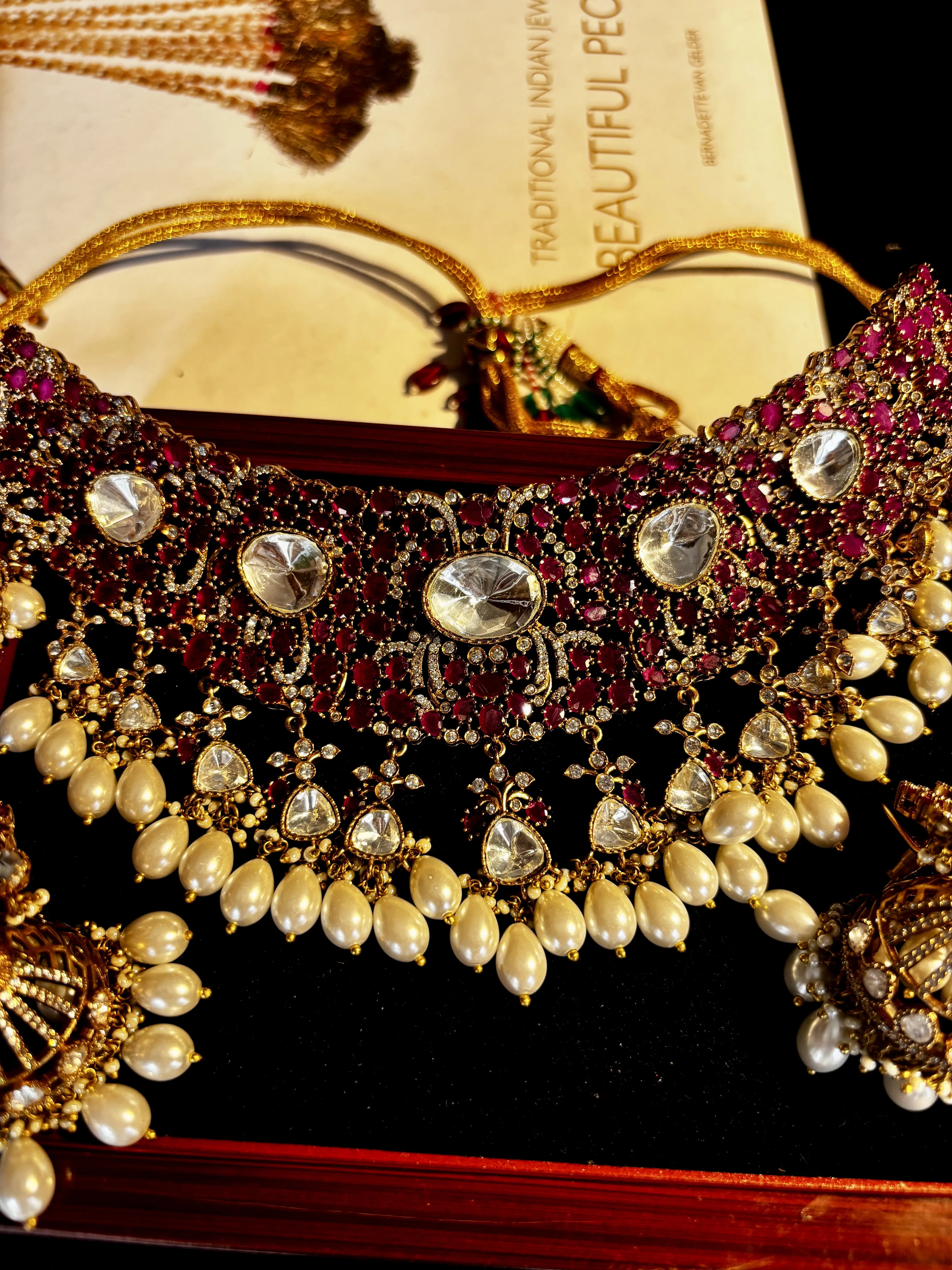 A vision of timeless opulence, the Noor-e-Gulab Kundan Choker Set is crafted for moments that demand grandeur. This regal choker showcases a deep rose–magenta base, intricately hand-set with luminous kundan stones that shimmer with every movement. The neckline is beautifully finished with layers of soft pearl drops, adding a classic bridal grace reminiscent of royal mehfils and heirloom treasures.