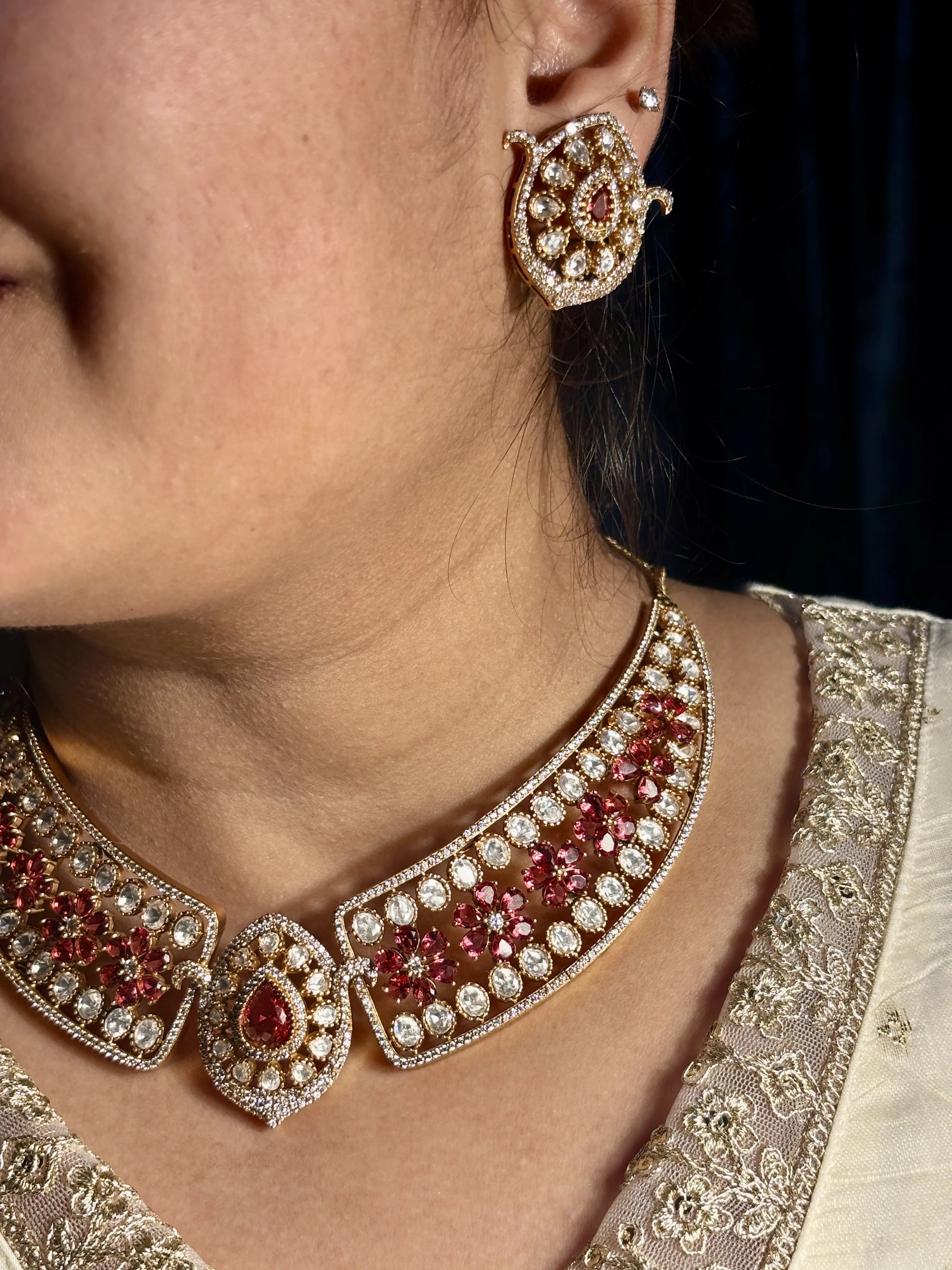 An ode to timeless royalty, the Rani Gulnaar Red Necklace Set is a striking blend of classic craftsmanship and refined grandeur. This exquisite choker is adorned with delicate ruby-toned floral motifs, each hand-set amidst a halo of luminous clear stones that shimmer beautifully against the antique gold base.