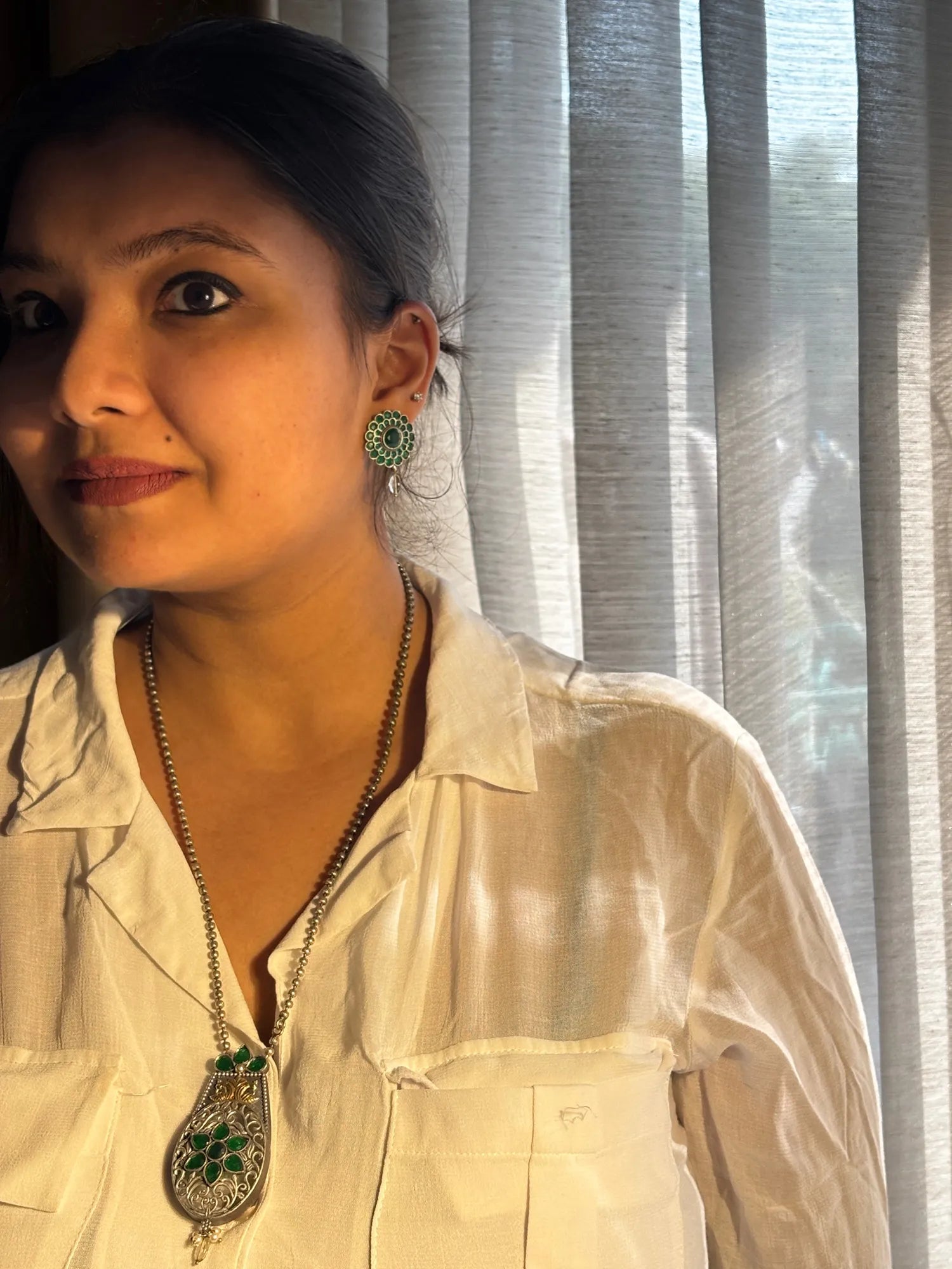 A striking handcrafted pendant set that celebrates timeless Indian artistry. The statement pendant features intricate silver-toned filigree, highlighted with rich emerald-green stones arranged in a floral lattice, creating depth and old-world charm. Paired with matching stud earrings, the set is finished with a classic beaded chain that adds balance and elegance.